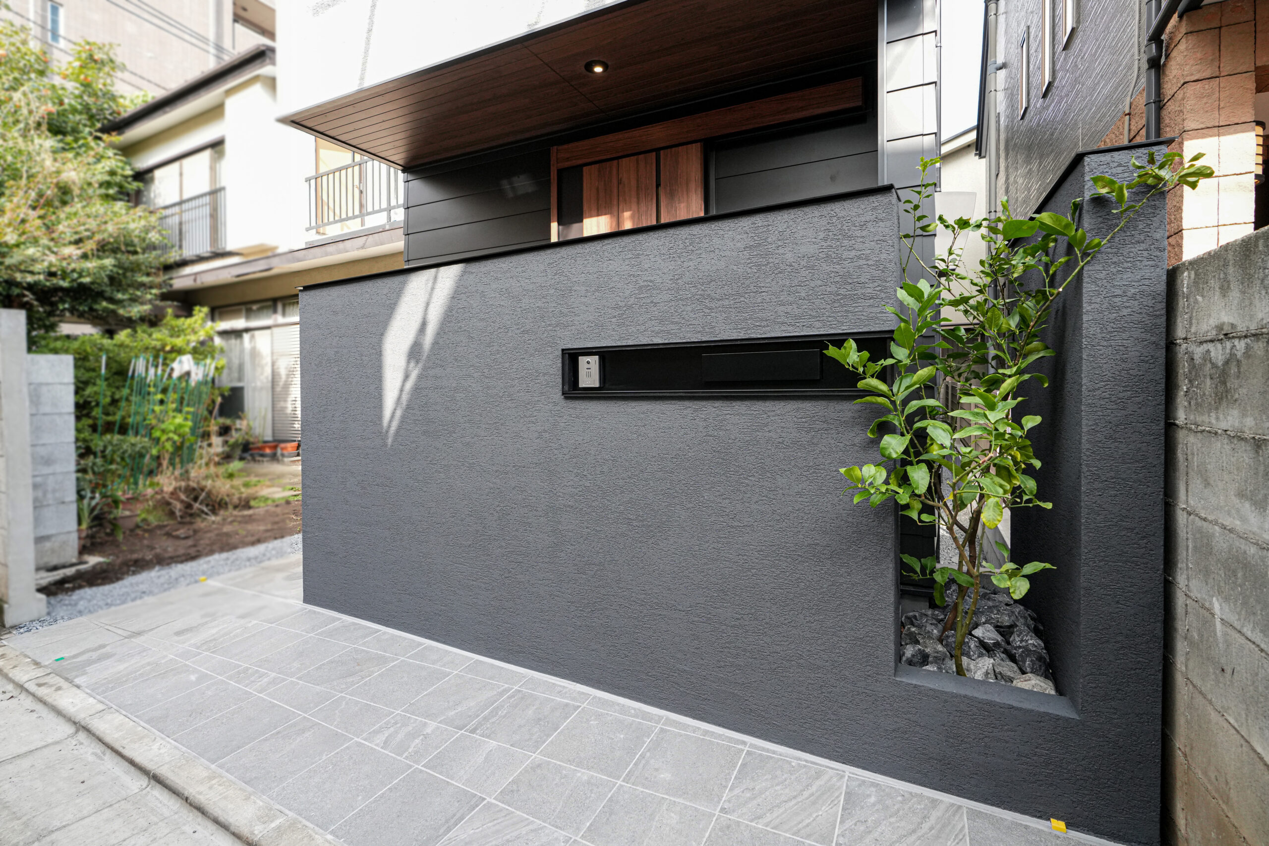 外壁にもジョリパットを使用。麻炭を混ぜて落ち着いた色合いを出しています。