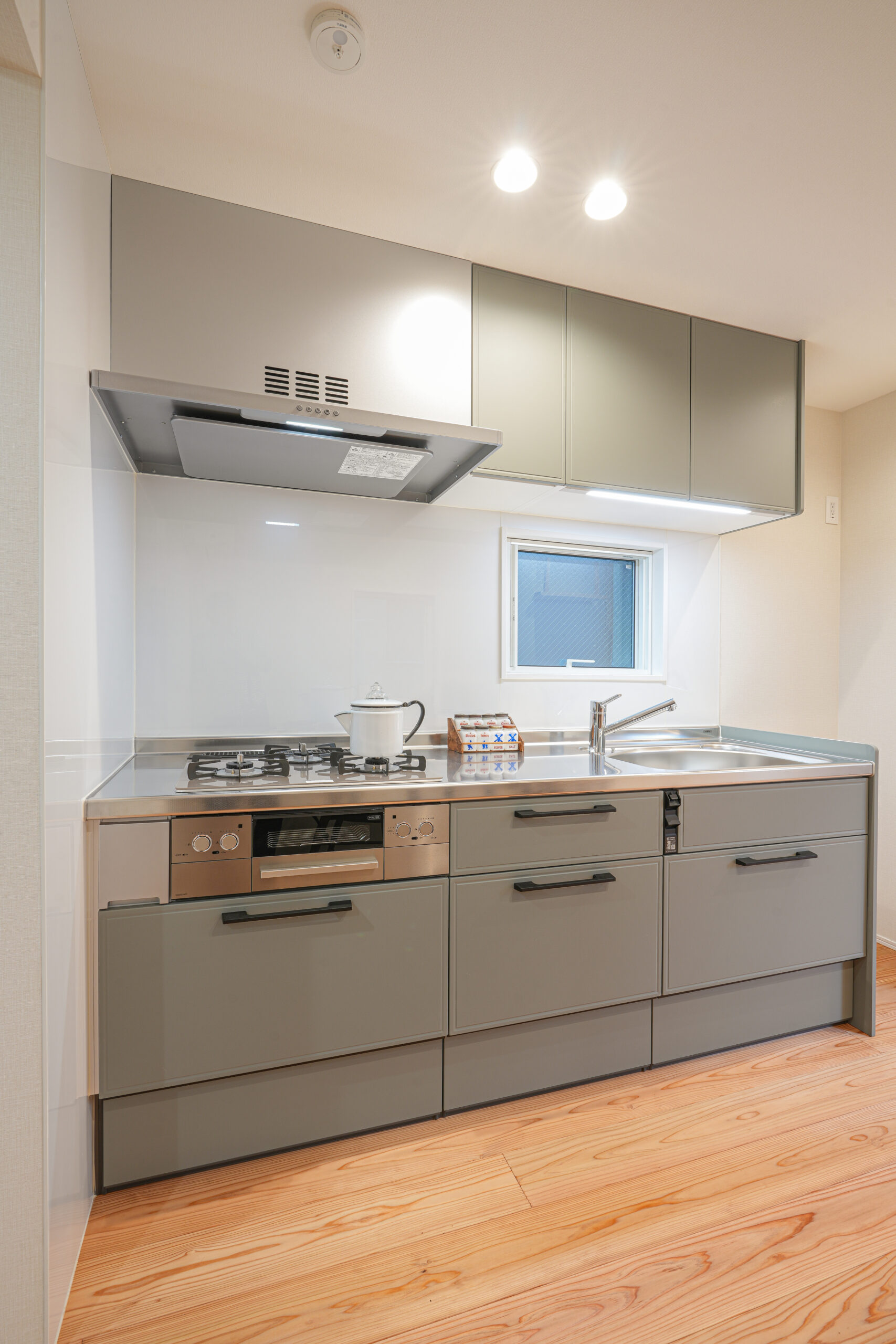 シンプルでモダンな高性能キッチン(幅2,100mm・LIXIL製)。しっかりと握りやすい引き出しのハンドルもポイントです。