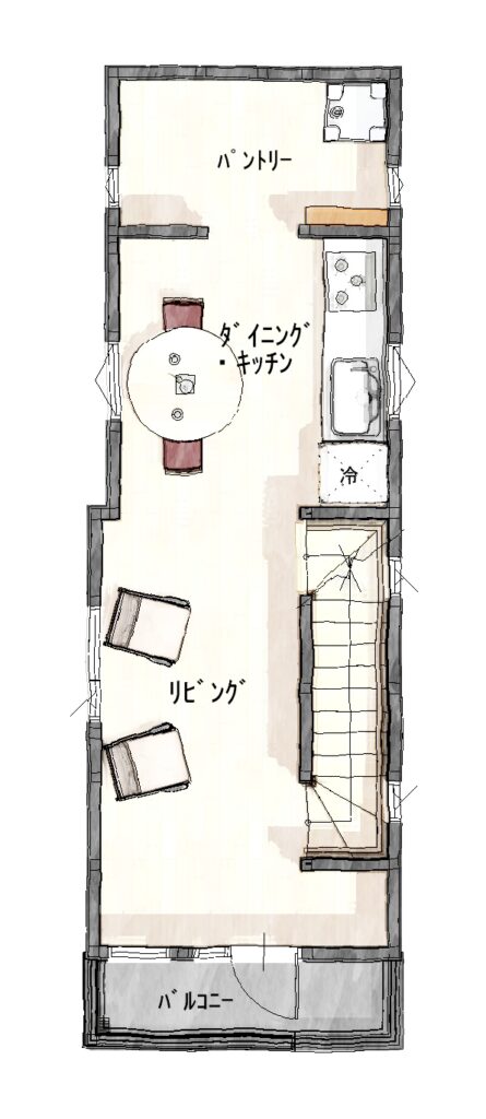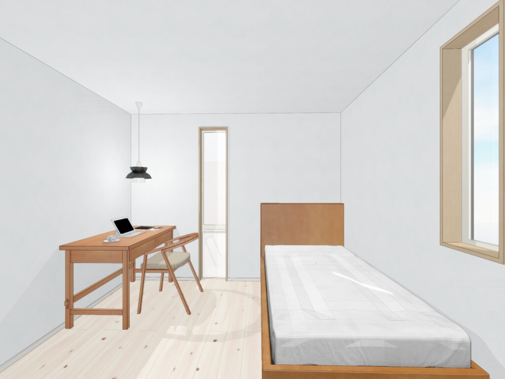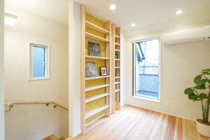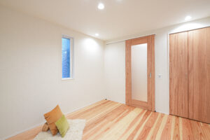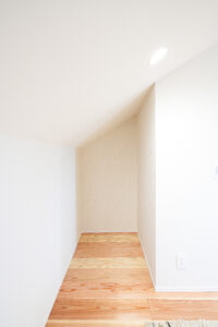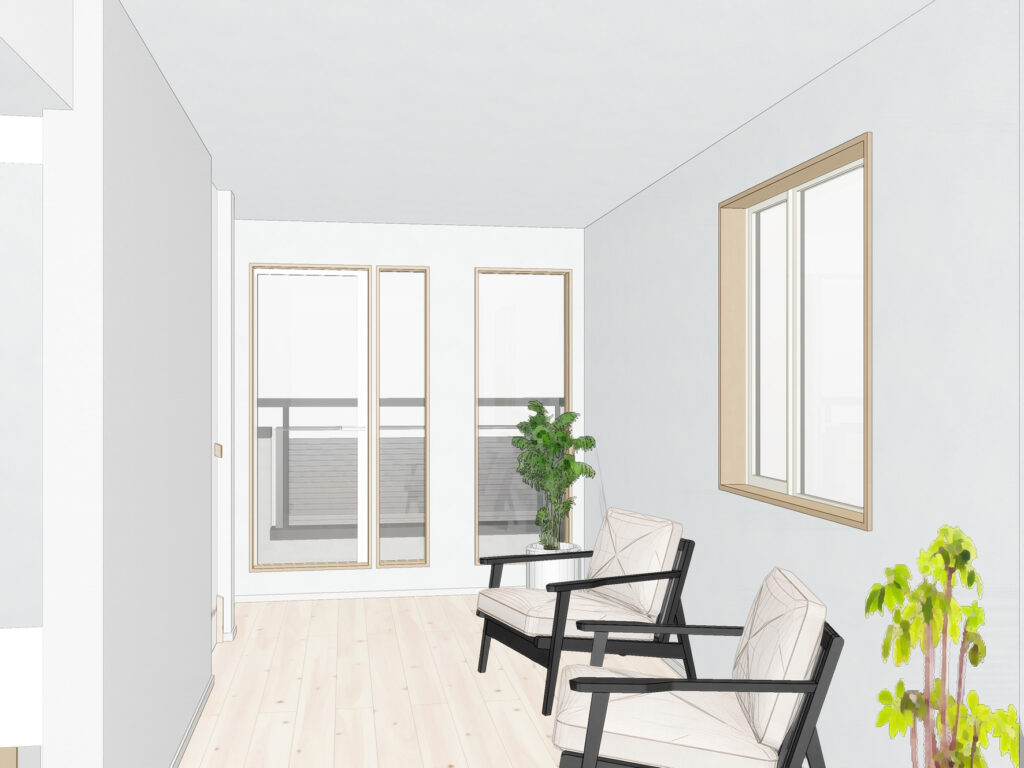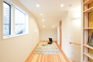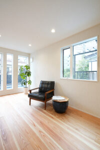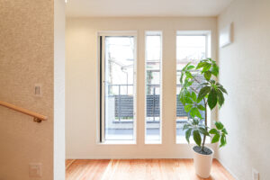 1Fの洋室は北側に面していて且つ、近隣の建物が密接し採光が取りづらい間取りになりますが、床までの縦に長い窓(スリット窓)を設けることで部屋に高さと広がりを感じさせ、外の視線から守り一年を通して安定した光が広がるように設計しています。