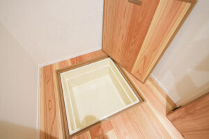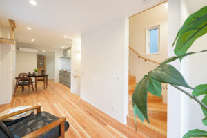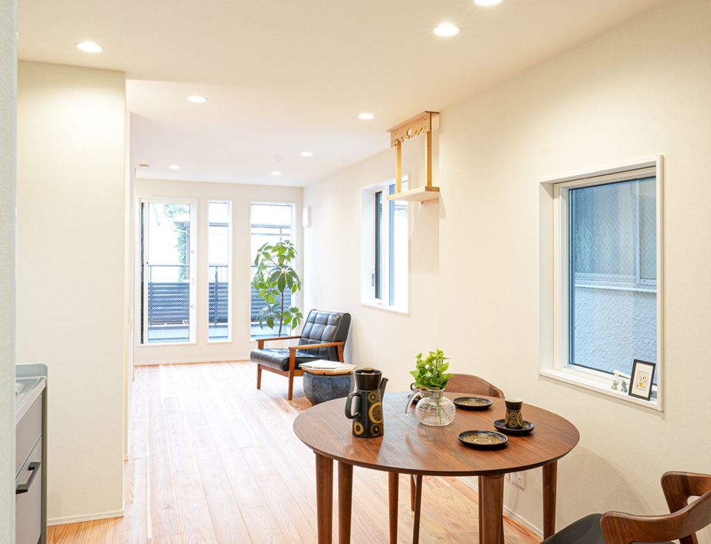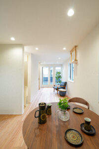 また、ウインドウキャッチの窓が設置されており、明かりを取り入れつつ自然の風を活用する設計になっています。東京の気候に合わせて、冬は北風、夏は南風を利用して窓を開けることで部屋全体に風が通り抜けるようになっており、快適な空間を提供します。
