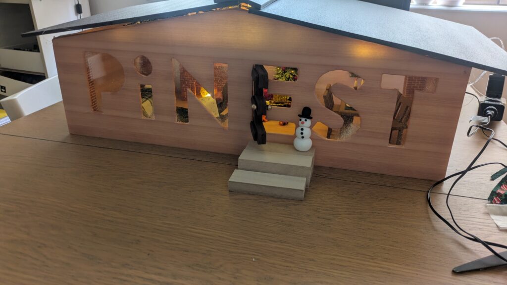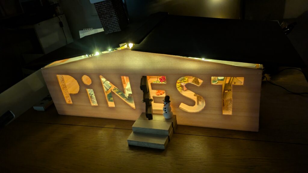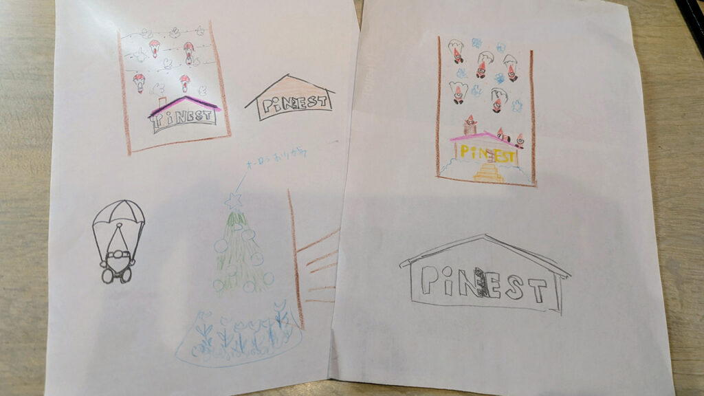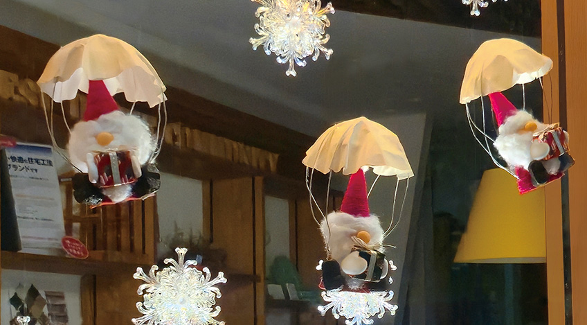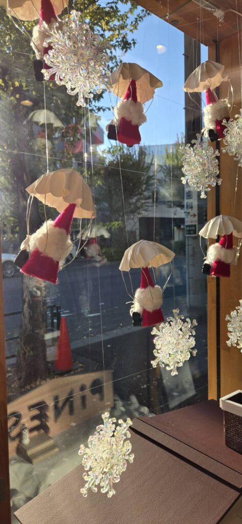 今回もどんなショーウィンドウにしようかな…と考えていた時に、我が家の子どもが小さい時にパラシュートが付いたサンタクロースを飾っていたな~と思い出し、ピネストのショーウィンドウにもサンタを舞い降りさせてみよう!と考えました。