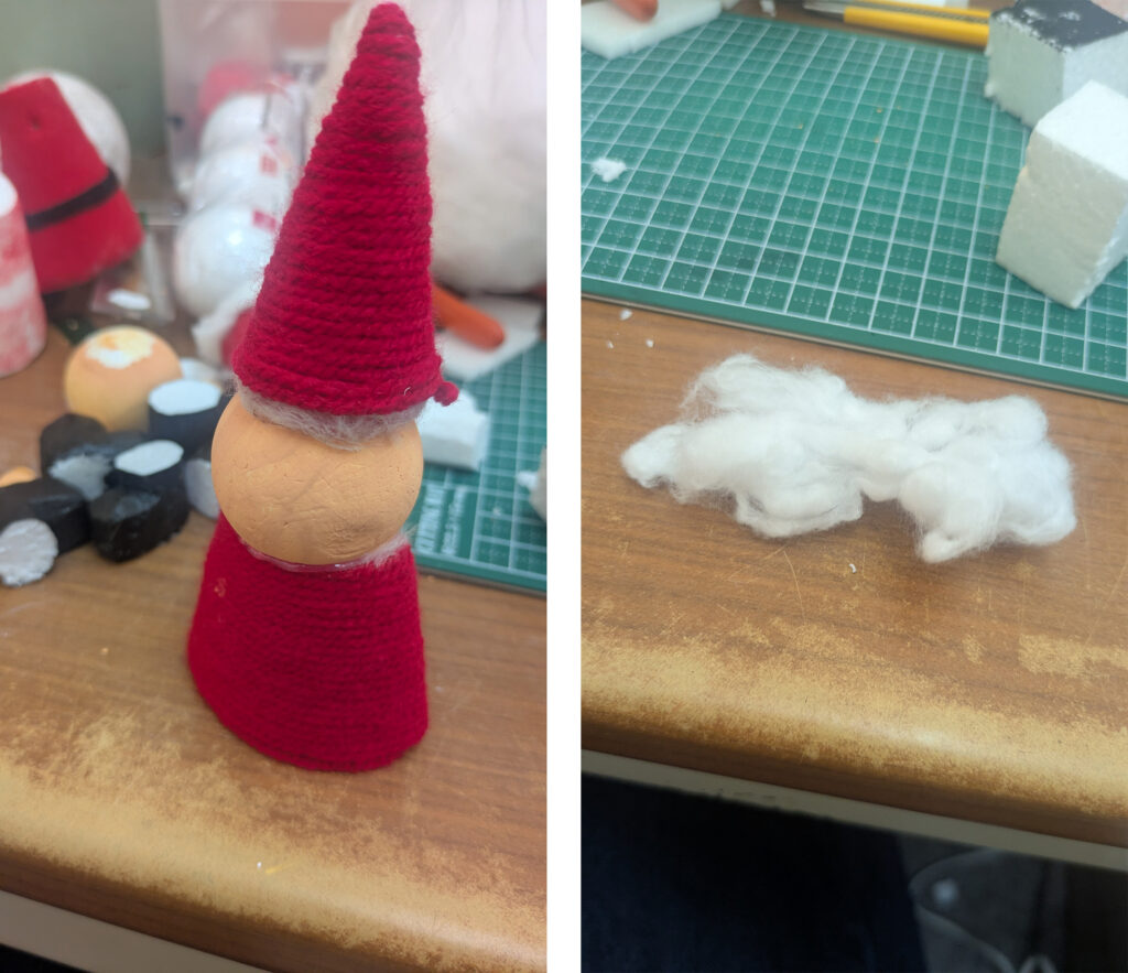 髭と髪の毛は、手を水で少し湿らせて手のひらで綿をこねるようにクルクル転がすとモジャモジャの綿のできあがり!それをグルーガンで付けていきます。