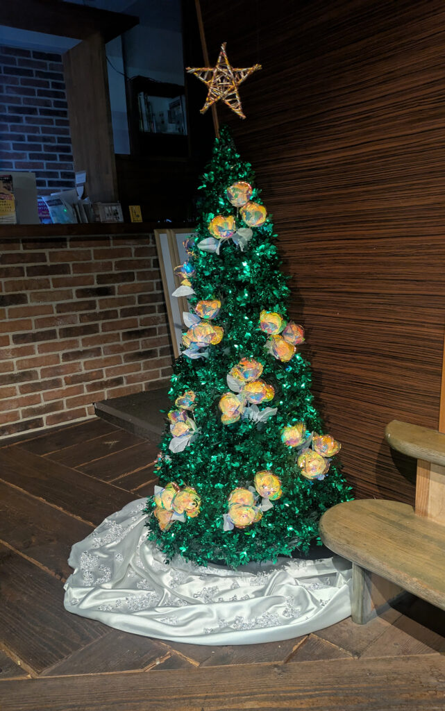 ツリー本体は昔から使用している古いもので、オーナメントなどもくっついた仕様でしたが、今回は外してグリーンの葉の装飾とオーロラフィルムでできた造花を飾りました。