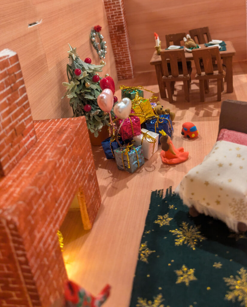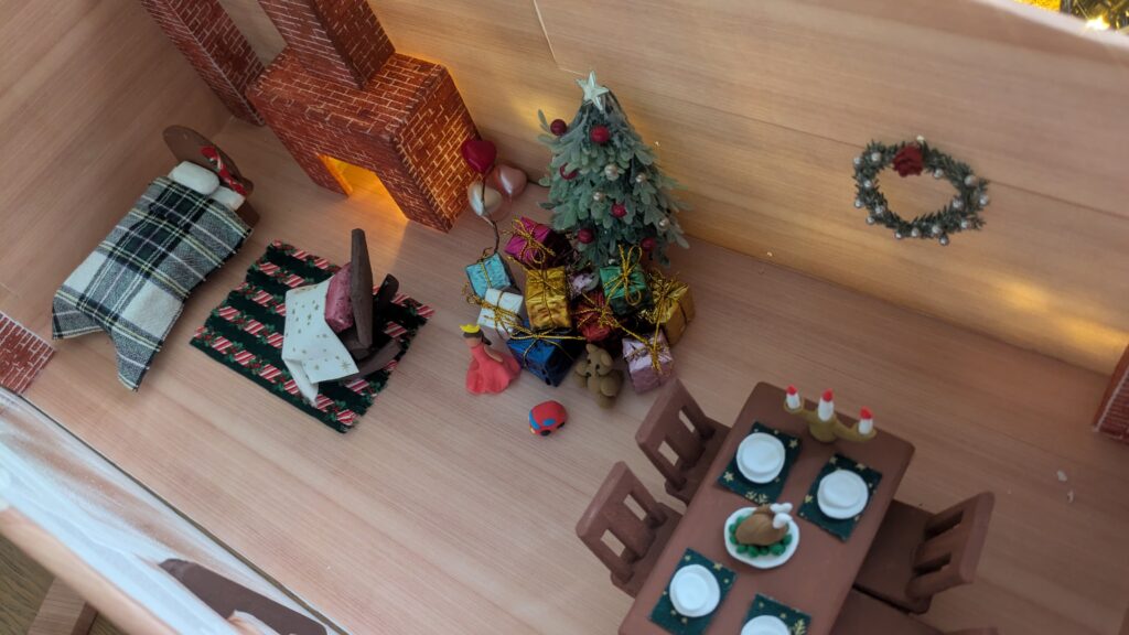家の中には暖炉、暖炉のそばには膝掛けが用意してあるロッキングチェア、靴下が掛けてあるベッド、可愛いツリー、子どもたちへのたくさんのプレゼント、壁にはリース、テーブルには七面鳥とディナーの用意が🍴。