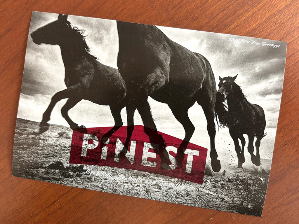2026年のピネストの年賀状は、躍動感あふれる馬の写真が全面に入った