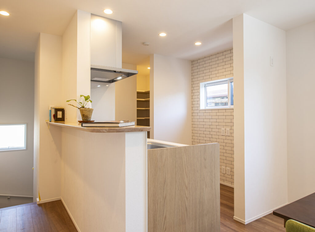 2Fキッチンの背面にタイル柄の壁紙を。