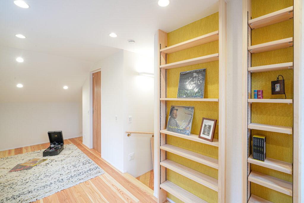 3Fの壁の厚さを利用した造り付け棚の背面に、黄色い壁紙をアクセントとして施工しました。