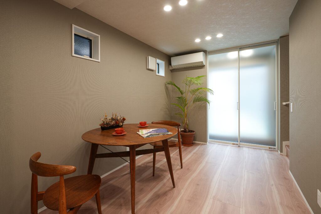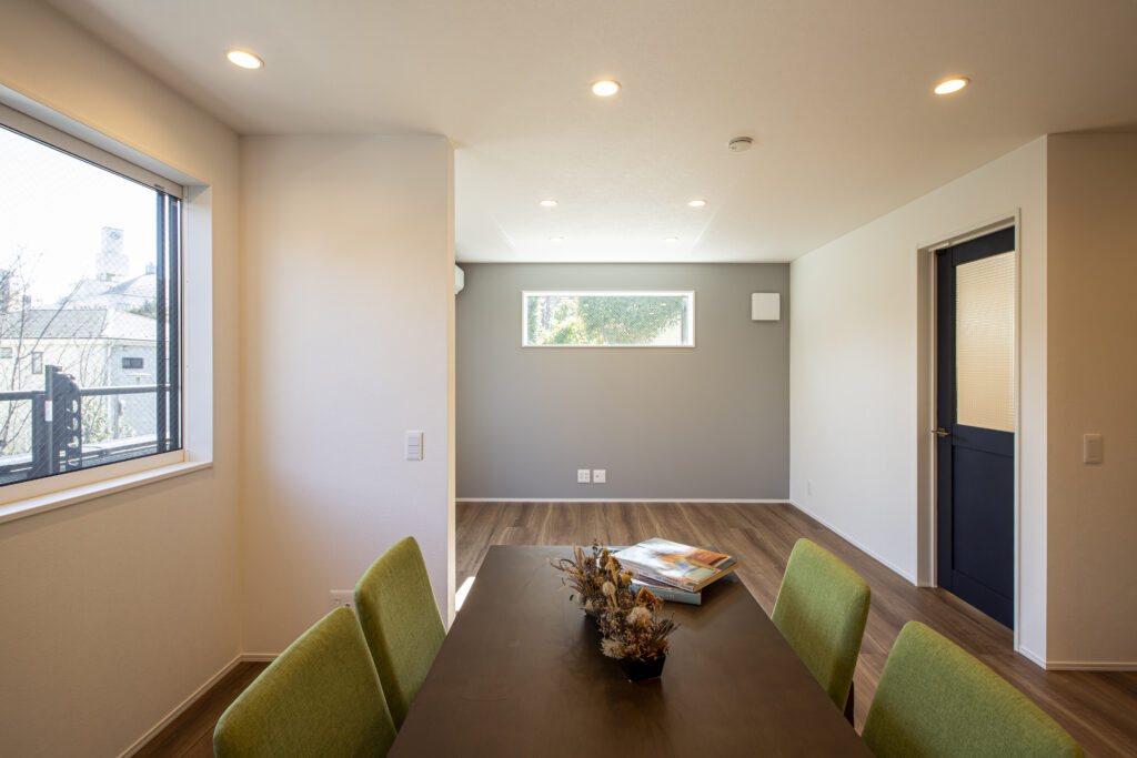 2Fリビングの1面をグレーの壁紙にし、部屋全体の雰囲気を統一。