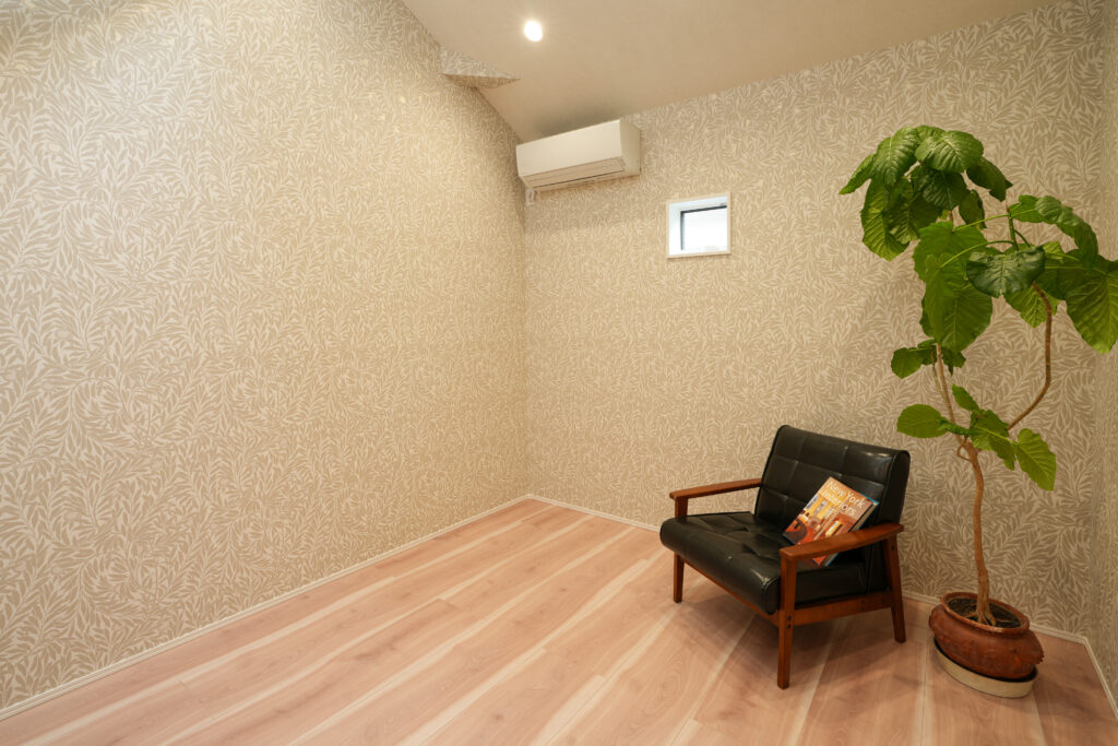 2Fの主寝室は全体に植物の柄の壁紙を施工しました。