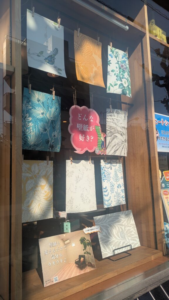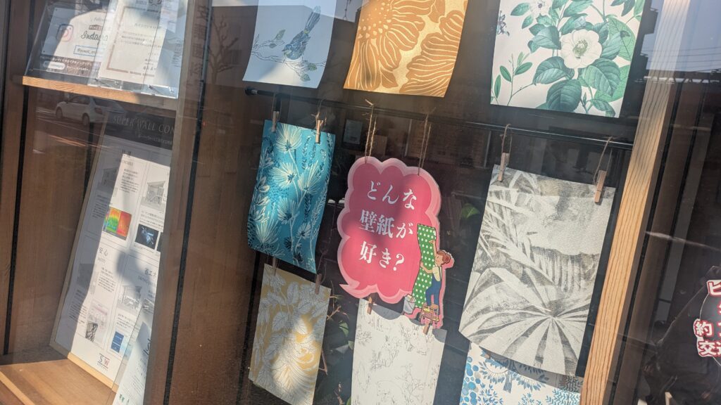 今回のショーウィンドウの展示は、色々な柄が楽しい「壁紙」です。